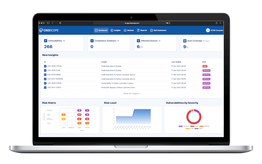 CISOSCOPE bietet eine herstellerübergreifende Analyse bestehender und neuer Bedrohungen, Schwachstellen und Cyber-Risiken für Ihre IT-Plattform.